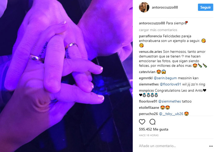 Y como cita en otra fotografía de Instagram la argentina, lo suyo es una historia para toda la vida: "Siempre". En esta imagen Antonella nos permite ver de cerca las alianzas del enalce, compartiendo así con sus seguidores los detalles más íntimos del gran día. Dos anillos clásicos en oro, que cada uno lleva encima del tatuaje que comparten, una fecha cargada de significado para los dos.
