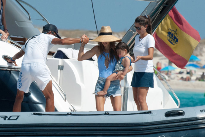 Después de una día de lo más divertido en alta mar, la familia también se acercó hasta la costa en una pequeña embarcación a motor y es que quisieron pasar varias horas en tierra firma para que la pequeña pudiera jugar con la arena. Para la ocasión Ariadne eligió un look de lo más cómodo con bañador en color azul celeste, pantalón corto vaquero, maxi sombrero de rafia y gafas de sol.