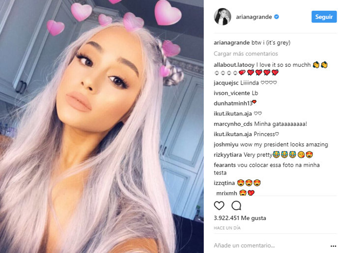 Ariana Grande ha sorprendido este fin de semana a todos sus fans en Instagram con un espectacular cambio de look. La cantante se ha unido a la moda del pelo de colores y ha decidido teñir su melena de color gris, al más puro estilo Khaleesi de Juego de Tronos. Parece que a sus fans les ha gustado este nuevo look, porque la fotografía que la artista ha compartido en sus redes sociales acumula ya más de 3 millones de me gusta.
