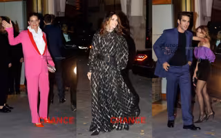 A su lado, sus queridos amigos Amaia Salamanca y el empresario Rosauro Varo. La actriz de Galerías Velvet, lucía un conjunto bien diferente al de Eugenia, ya que se declinó por un minivestido palabra de honor con un cuerpo malva y una minifalda ajustada negro de terciopelo y medias negras, y un cluth a juego.