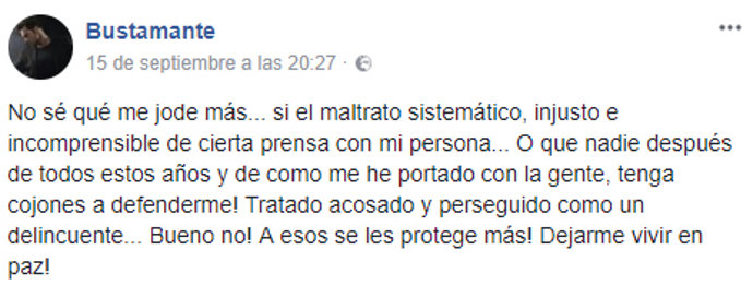 No solo lo hacía ante las cámaras, el cantante ha querido expresar en su facebook cómo se siente: "No sé qué me jode más... si el maltrato sistemático, injusto e incomprensible de cierta prensa con mi persona... O que nadie después de todos estos años y de como me he portado con la gente, tenga cojones a defenderme! Tratado acosado y perseguido como un delincuente... Bueno no! A esos se les protege más! Dejarme vivir en paz!".