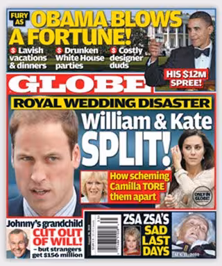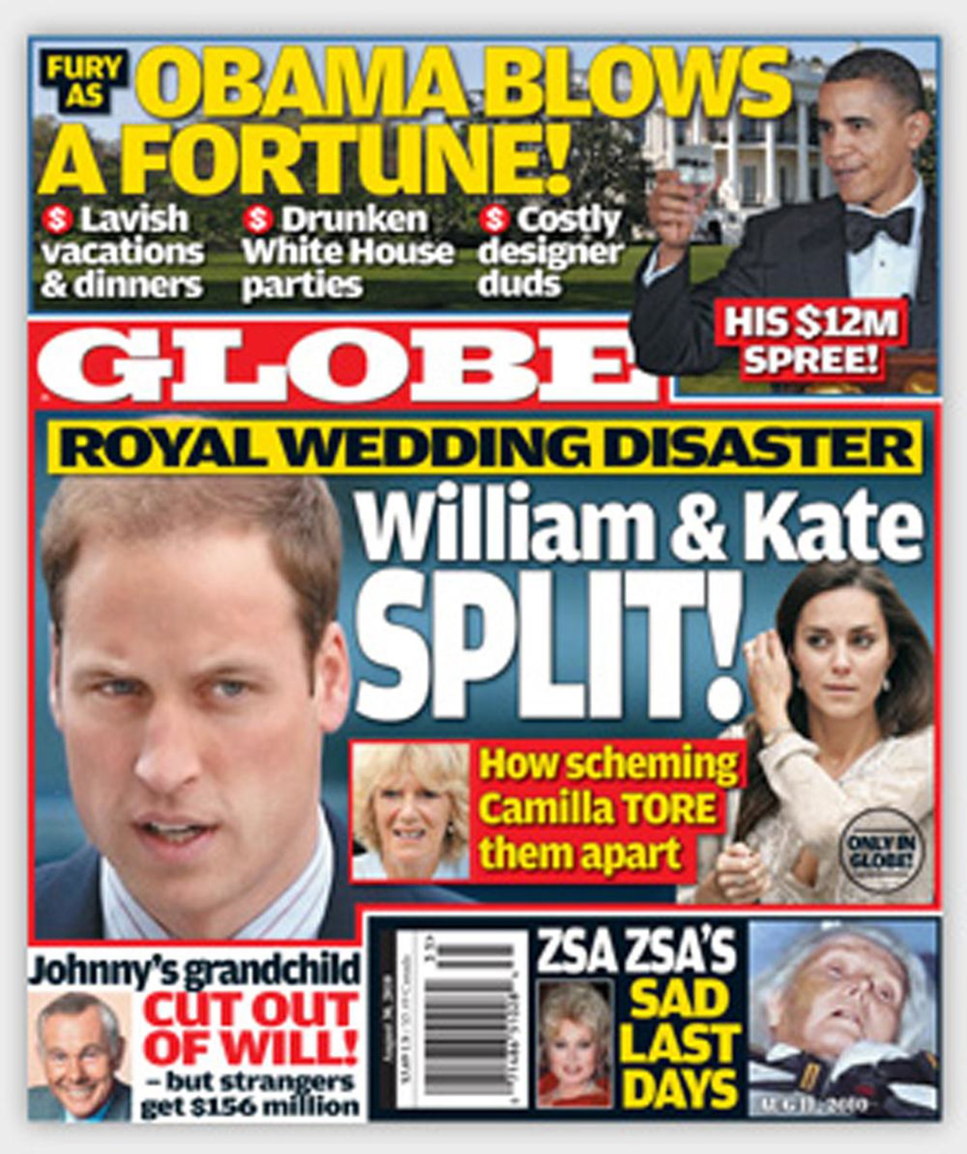Pudo haber sido la boda del siglo, pero el enlace entre el príncipe Guillermo de Inglaterra y su novia Kate Middleton ya no tendrá lugar. La revista estadounidense 'Globe' así lo ha titulado en su portada: "¡Guillermo y Kate han roto!" y un poco más abajo: "Cómo la manipuladora Camilla consiguió separarles".