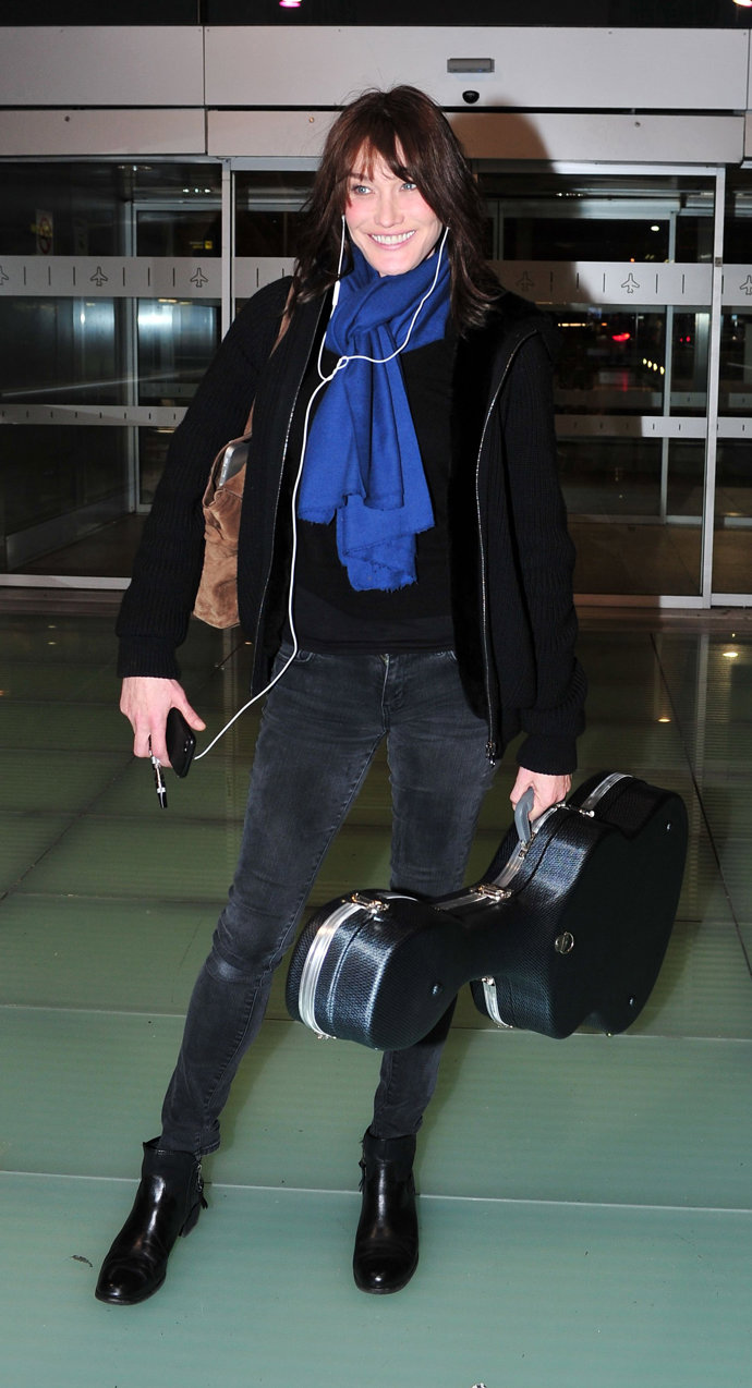 La mujer de Nicolas Sarkozy está de lo más ilusionado por su gira en España y es que presenta su nuevo disco French Touch este miércoles en el Teatro Nuevo Apolo de Madrid y el viernes en el Palau de la Música de Barcelona. Para la ocasión Carla eligió un look de lo más cómodo con pantalón vaquero negro, jersey en el mismo color y pañuelo en color azul klein.