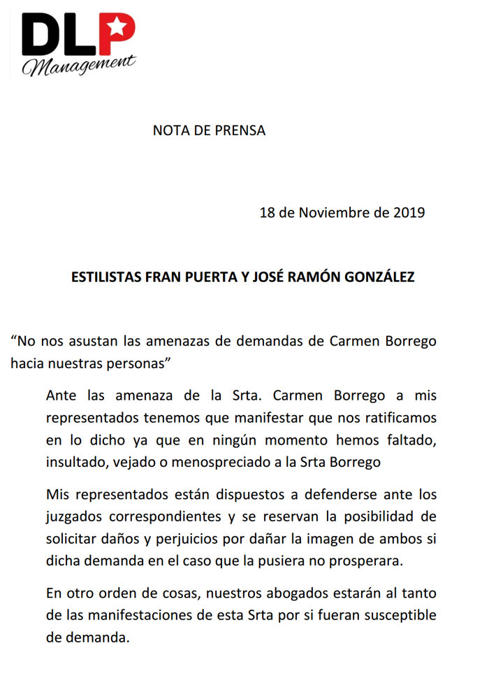 Tras el revuelo generado por sus declaraciones, los estilistas de Carmen Borrego han querido enviar un comunicado donde aseguran que no tienen miedo: "No nos asustan las amenazas de demandas de Carmen Borrego hacia nuestras personas".