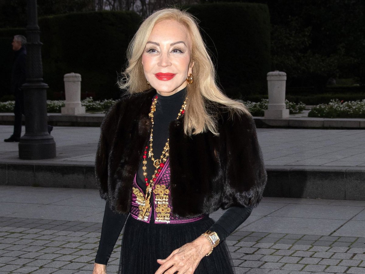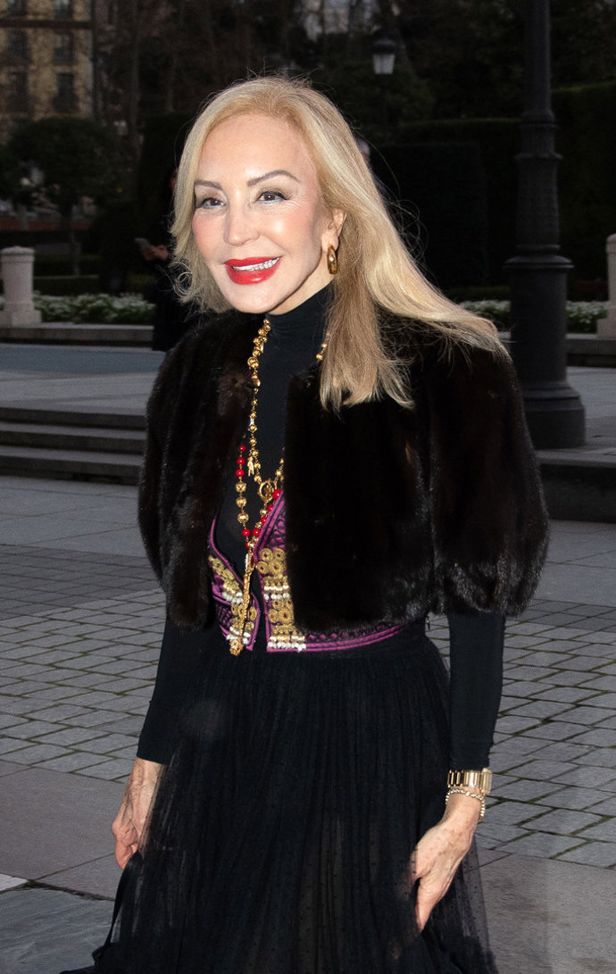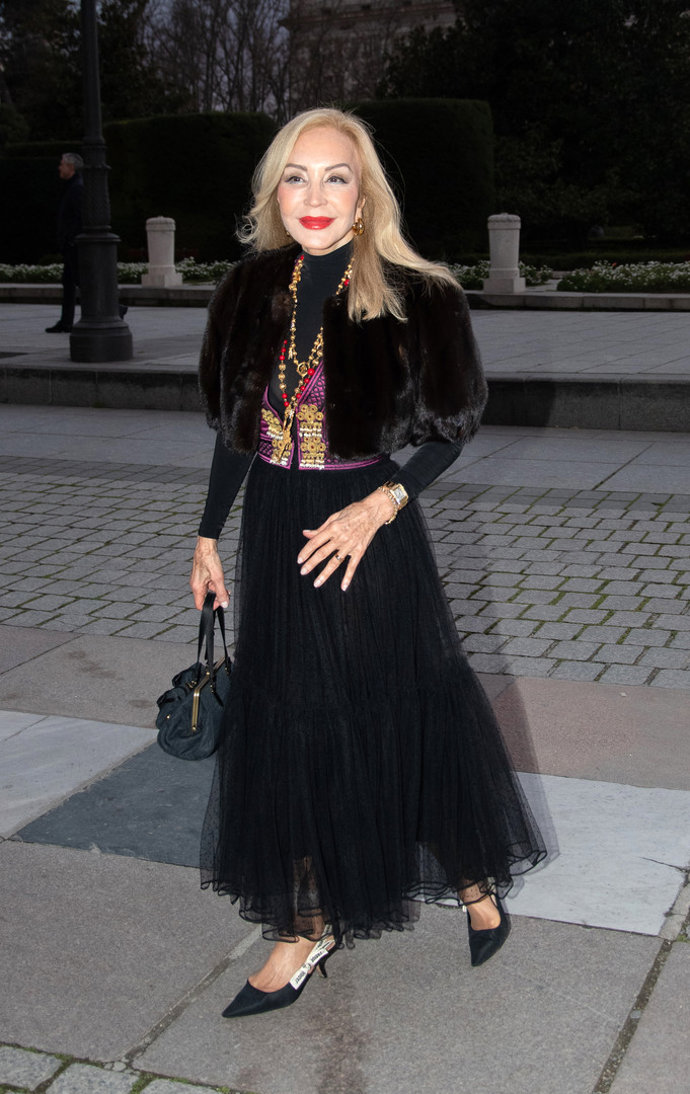 Pero si hay una invitada que ha brillado con luz propia, y se ha impuesto en su duelo de estilo frente a la 'reina de corazones' -ideal con un conjunto aterciopelado de top y pantalones acampanados de Silvia Tcherassi en azulón y negro- esa ha sido sin duda Carmen Lomana, que ha vuelto a dar una lección de elegancia con un look sencillamente impecable compuesto por una falda de tul negra con volantitos en el bajo y ligero vuelo, un bolero de piel al tono, y un chaleco de inspiración goyesca fucsia con bordados en dorado y negro sobre un top negro de lycra de cuello alto, que ha combinado con varios collares de abalorios, bolso negro de asa corta, y salones destalonados de Dior con lazada al tobillo en blanco.