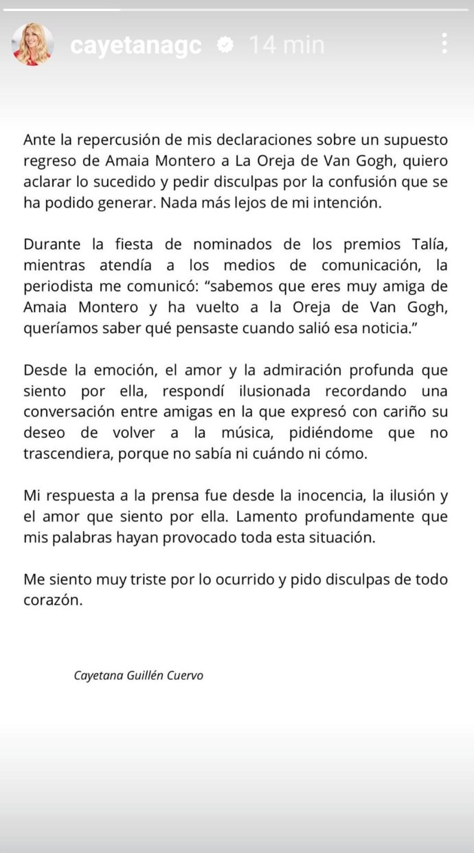 Como buena amiga de la ex integrante del mítico grupo, Cayetana confirmaba ante las cámaras hace tan solo unos días que Amaia Montero iba a regresar al panorama musical de la mano de los que un día fueron sus compañeros de escenario, unas declaraciones que ha tenido que rectificar con urgencia a través de las redes sociales. "Desde la emoción, el amor y la admiración profunda que siento por ella respondí ilusionada recordando una conversación entre amigas en las que expresó con cariño su deseo de volver a la música pidiéndome que no trascendiera, porque no sabía ni cuando ni como" ha explicado la actriz a través de su cuenta de Instagram.