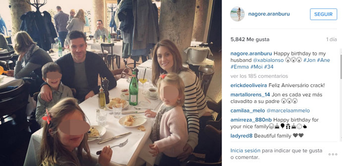 Xabi Alonso ha celebrado su 34 cumpleaños con la mejor compañía. O así ha dejado constancia su mujer, Nagore Aranburu, la cual nos ha mostrado una tierna instantánea de como han celebrado su cumpleaños.