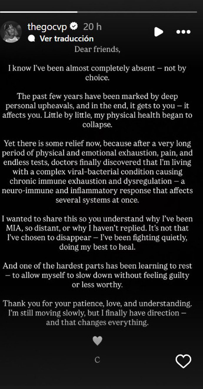 "Y una de las partes más difíciles ha sido aprender a descansar, permitirme ir más despacio sin sentirme culpable o menos digna. Gracias por vuestra paciencia, amor y comprensión. Todavía me muevo lentamente, pero finalmente tengo dirección, y eso lo cambia todo" ha concluido el comunicado con el que se ha abierto en canal como nunca.