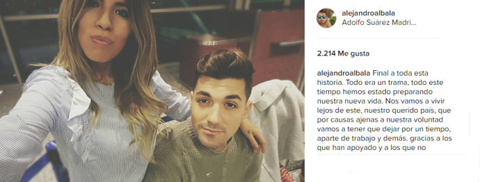 Por lo que las redes nos muestran, la pareja está ilusionada con esta nueva aventura. Mientras Chabelita ha utilizado la canción Cold Water de Justin Bieber para anunciar a todos sus seguidores la decisión, Alejandro Albalá ha querido explicar con este enigmático mensaje lo que siente: "Final a toda esta historia. Todo era una trama, todo este tiempo hemos estado preparando nuestra nueva vida. Nos vamos a vivir lejos de este, nuestro querido país, que por causas ajenas a nuestra voluntad vamos a tener que dejar por un tiempo, aparte de trabajo y demás. Gracias a los que han apoyado y a los que no también. Un beso fuerte".