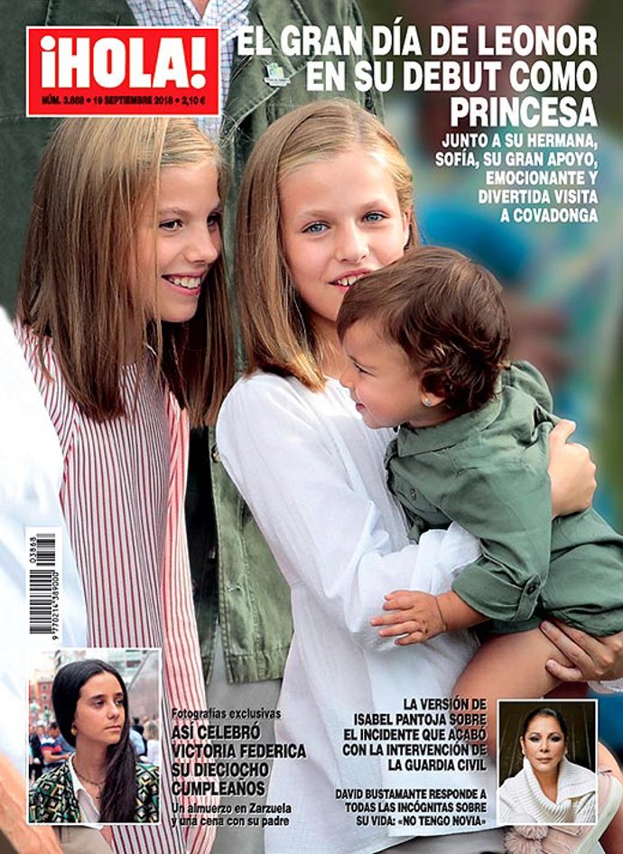 ¡Hola! ha mostrado en portada una de los eventos más especiales de Leonor, su primer viaje oficial como princesa de Asturias bajo el titular: "El gran día de Leonor en su debut como Princesa!" y añaden: "Junto a su hermana, Sofía, su gran apoyo, emocionante y divertida visita a Covadonga".