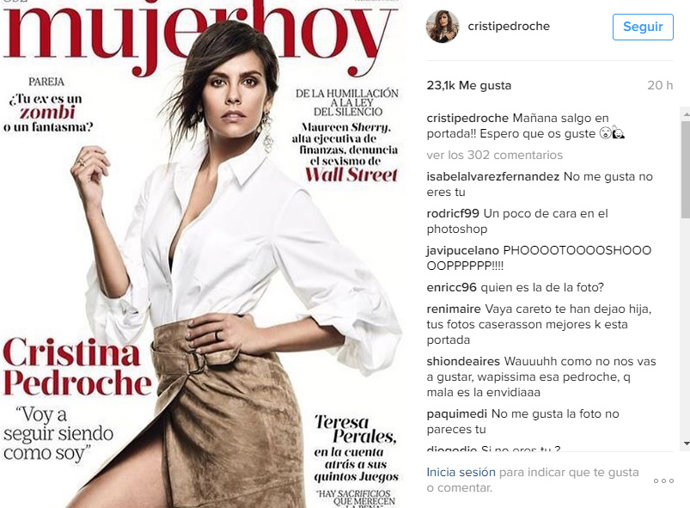 A través de su cuenta de Instagram, la conductora de Pekín Express mostraba orgullosa la portada que protagoniza en una imagen que acumula más de 300 comentarios y 23.000 Me gusta. Acompañada de la frase "Voy a seguir siendo como soy", Pedroche se mostraba físicamente irreconocible en una fotografía evidentemente retocada. Sus seguidores se percataron enseguida del uso de Photoshop y los comentarios del tipo "Quién es la de la foto?" o "No pareces tú" no tardaron en llegar.