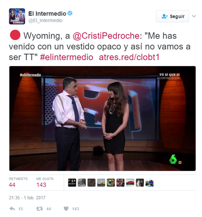 La pasada noche del miércoles 1 de febrero, la vallecana acudía al programa de Wyoming El Intermedio con un vestido negro y sin sus tan adoradas transparencias, algo que sorprendió al presentador que se atrevió incluso a bromear con su vestimenta: "Me has venido con un vestido opaco y así no vamos a ser TT".