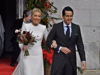Sin escote, con cuello redondo, hombreras que realzaba su figura física y mangas largas con detalles bordados, Cristina ha lucido un vestido ajustado en la parte de arriba y una falda hasta el suelo más amplia. Además, llevaba entre sus manos un ramo con colores fuertes y un tocado a modo de velo moderno.