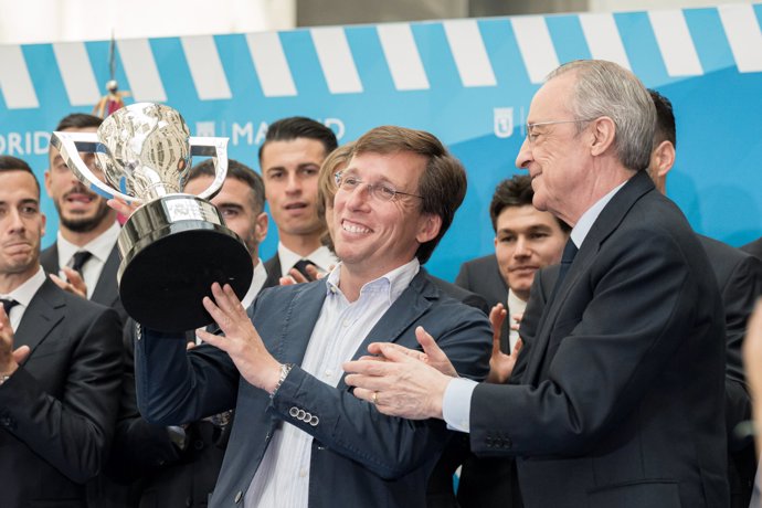Pero antes de ofrecer la Liga a su afición, el presidente Florentino Pérez, el entrenador Carlo Ancelotti y toda la plantilla blanca cumplieron con los compromisos institucionales visitando tanto el Ayuntamiento como la Comunidad de Madrid, donde han sido recibidos por José Luis Martínez-Almeida e Isabel Díaz Ayuso.