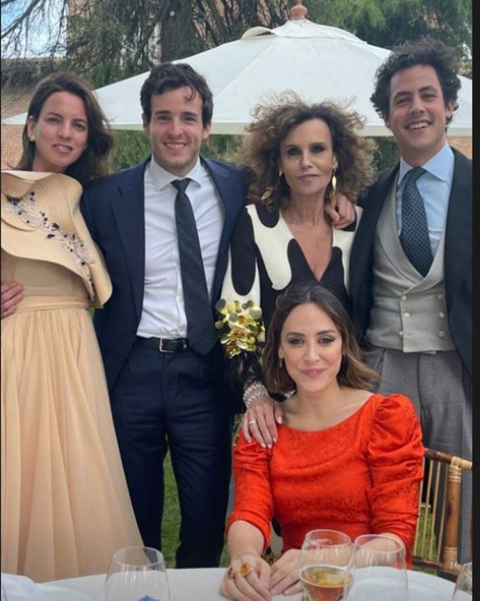 Muy favorecida con un vestido rojo que resalta su tono de piel, Tamara posa junto a Íñigo y otros invitados del enlace luciendo su mejor sonrisa, fiel reflejo del dulce y feliz momento que viven.