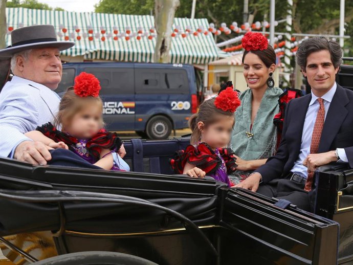 El Duque de Alba, su hijo Fernando Fitz-James Stuart, su nuera Sofía Palazuelo, y sus nietas, Rosario y Sofía, pasean en coche de caballos por la Feria de Abril, a 8 de mayo de 2025, en Sevilla (Andalucía, España). - EUROPA PRESS REPORTAJES
