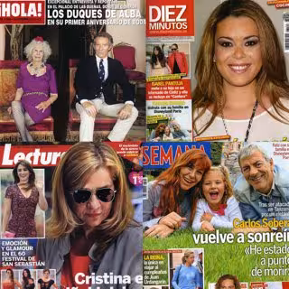 Pero no podíamos dejar de describir las portadas de 'Lecturas', quien cuenta que los Urdangarín abandonan su casa de Pedralbes para instalarse en un piso más modesto justo cuando cumplen 15 años de casados. La entrevista en exclusiva de Carlos Sobera en 'Semana', quien cuenta con alivio la experiencia de estar a punto de morir cuando fue perseguido por un elefante durante su viaje a África. Y también las declaraciones de Tita Cervera en '¡Hola!' ante la imputación de su hijo Borja: "Ninguna madre que quiera a su hijo como yo le quiero soportaría verlo en el banquillo".