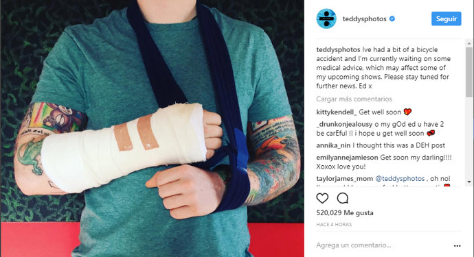 El cantante fue trasladado al hospital, donde le escayolaron el brazo derecho confirmándole la ruptura de éste. El cantante utiliza sus brazos para tocar los instrumentos mientras canta sus exitosas canciones, por lo que ha querido informar él mismo a sus fans a través de su Instagram: "He tenido un accidente de bicicleta y estoy esperando el consejo del médico, porque podría afectar a mis próximos shows. Por favor estad atentos a las nuevas noticias. Ed x".