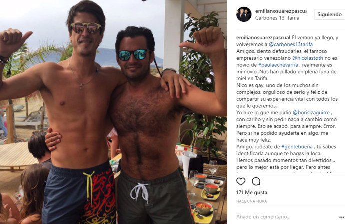 Además Emiliano ha bromeado asegurando que los que tienen una relación son él y Nicolás y no Paula Echevarría como se había comentado, poniendo el tono de humor a esta historia: "Amigos, siento defraudarles, el famoso empresario venezolano @nicolastoth no es novio de #paulaechevarria , realmente es mi novio. Nos han pillado en plena luna de miel en Tarifa."