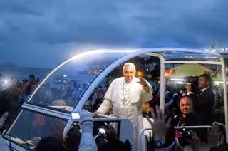 Y tras detenerse bajó del vehículo y caminó al lado derecho del auto, donde estrechó manos y un feligrés le acercó un niño pequeño, envuelto en un abrigo y un gorro, al que besó. Después se trasladó al lado izquierdo del carro donde besó a otros niños antes de volver al vehículo.