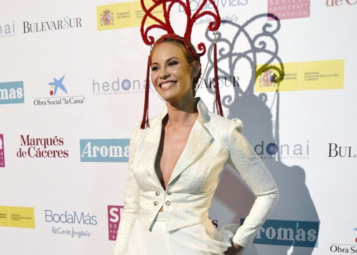 Llamativo fue uno de los diseños con un vestido largo semitransparente de encaje dorado que dejaba entrever su escultural cuerpo en ropa interior. Otro de los vestidos estaba formado por una falda larga y chaqueta de frac con cuello en forma de corola, muy parecido al que lució la reina Letizia en su vestido de novia, y pronunciado escote muy favorecedor. Alejandro Postigo cerró el desfile junto a todas sus modelos y apareció orgulloso de la mano de su musa, Jessica Bueno.