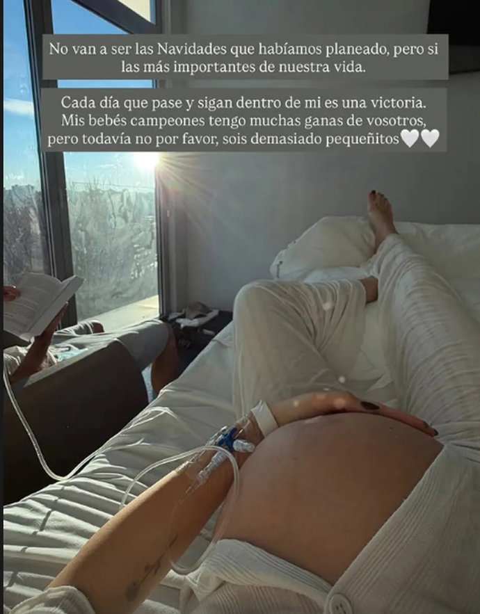 Desde la cama del centro médico tocándose la barriguita, con una vía puesta en la muñeca y acompañada por su pareja Juan Iglesias, la influencer -que no ha revelado el motivo por el que se encuentra en observación, aunque todo apunta a que habría tenido ya contracciones de parto, habituales antes de que el embarazo llegue a término en el caso de embarazos múltiples como el suyo- ha reconocido que "cada día que pase y sigan dentro de mí es una victoria. Mis bebés campeones... Tengo muchas ganas de vosotros, pero todavía no, por favor, sois demasiado pequeñitos".