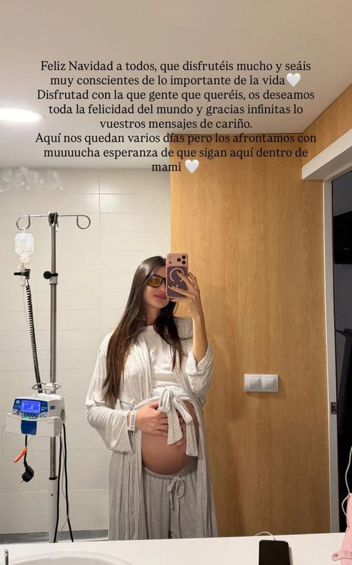 Además, ha actualizado su estado, revelando que aunque "aquí nos quedan varios días" -por lo que podría pasar también Nochevieja y Año Nuevo ingresada- "los afrontamos con mucha esperanza de que sigan aquí dentro de mami", intentando poner su mejor cara pese a este contratiempo en su última Navidad antes de convertirse en padres.