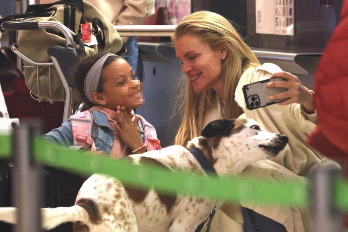 La modelo acuda al Aeropuerto Adolfo Suárez-Madrid Barajas junto a su hija y su perra, con quienes compartía un momento muy entrañable al hacerse un selfie sonriente mientras la perra lamía el rostro de la pequeña. Madre e hija compartieron risas, mostrando el buen vínculo que hay entre ellas.