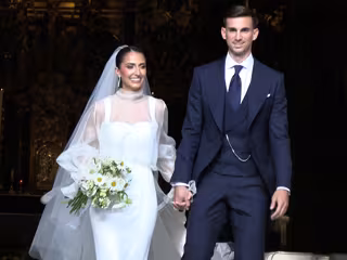 Para el gran día, la novia apostó por un vestido blanco de lo más sencillo, de inspiración clásica con falda recta y elegante cuerpo con transparencias, mangas abullonadas y velo vaporoso. Por su parte, el futbolista del Paris Saint-Germain optó por un traje azul marino de tres piezas, muy elegante y sobrio.
