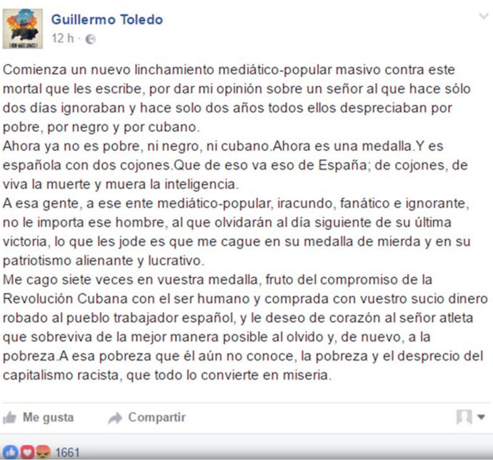 "Comienza un nuevo linchamiento mediático-popular masivo contra este mortal que les escribe, por dar mi opinión sobre un señor al que hace sólo dos días ignoraban y hace solo dos años todos ellos despreciaban por pobre, por negro y por cubano. Ahora ya no es pobre, ni negro, ni cubano. Ahora es una medalla. Y es española con dos cojones. Que de eso va eso de España; de cojones, de viva la muerte y muera la inteligencia.