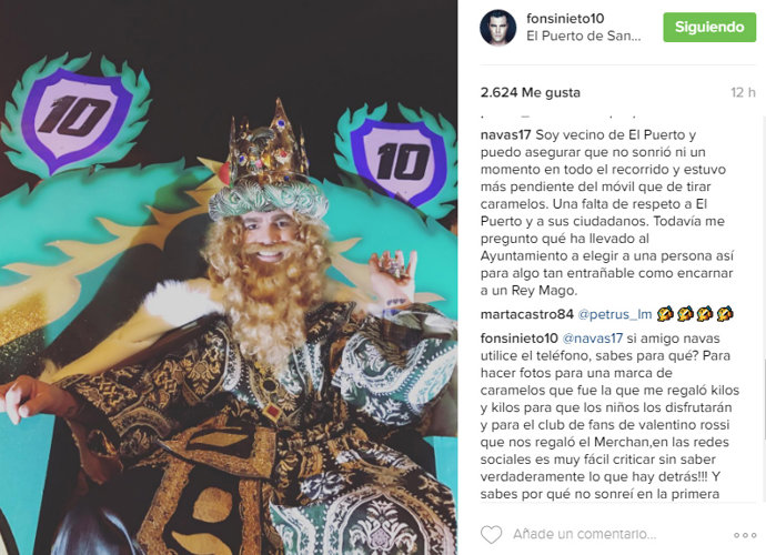 La expareja de Alba Carrillo subió una foto disfrazado a su cuenta de Instagram agradeciendo a quienes han hecho posible la experiencia y compartiendo la experiencia, pero lo que era un momento de felicidad se ha convertido en agridulce por comentarios, de aquellos que pudieron ver a Fonsi con sus propios ojos: "Soy vecino de El Puerto y puedo asegurar que no sonrió ni un momento en todo el recorrido y estuvo más pendiente del móvil que de tirar caramelos. Una falta de respeto a El Puerto y a sus ciudadanos. Todavía me pregunto qué ha llevado al Ayuntamiento a elegir a una persona así para algo tan entrañable como encarnar a un Rey Mago".
