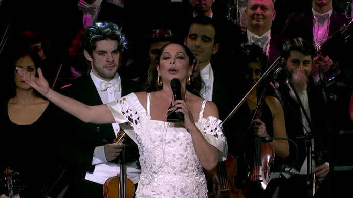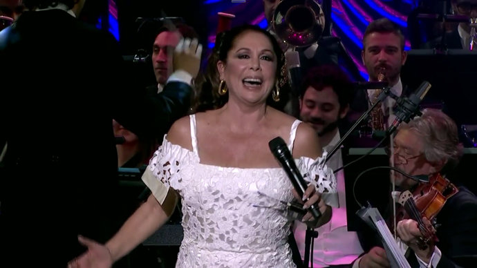 El concierto que se ha emitido en streaming desde la pagina oficial de la cantante ha comenzado con la aparición de la artista en solitario, luciendo el mismo vestido blanco que en la portada de su nuevo proyecto. Ante los aplausos y gritos del público no ha podido evitar emocionarse y tras su primera indirecta: "Sigo estando aquí... estoy en desacuerdo, hay que olvidar lo que no hace bien, lo que hace mal..." se ha levantado el telón y han aparecido los 83 músicos de la orquesta sinfónica dirigida por Carlos Checa, comenzando con el popular éxito de Juan Gabriel "Se me olvidó otra vez" .