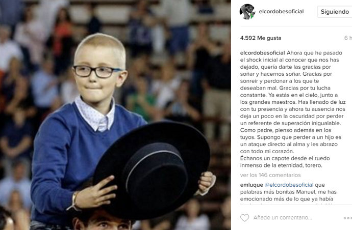 Sin embargo Adrián consiguió cumplir su sueño realidad y salir por la puerta grande de la plaza de toros de Valencia. Ahora grandes maestros le rinden su último adiós. El primero ha sido Manuel Díaz, El Cordobés, que no ha podido contener la emoción tras conocer la trágica noticia. "Quería darte las gracias por soñar y hacernos soñar. Gracias por sonreir y perdonar a los que te deseaban mal. Gracias por tu lucha constante. Ya estás en el cielo, junto a los grandes maestros" ha compartido el maestro, queriendo lanzar un mensaje de apoyo y animo a los padres del pequeño: "Has llenado de luz con tu presencia y ahora tu ausencia nos deja un poco en la oscuridad por perder un referente de superación inigualable. Como padre, pienso además en los tuyos. Supongo que perder a un hijo es un ataque directo al alma y les abrazo con todo mi corazón. Échanos un capote desde el ruedo inmenso de la eternidad, torero".