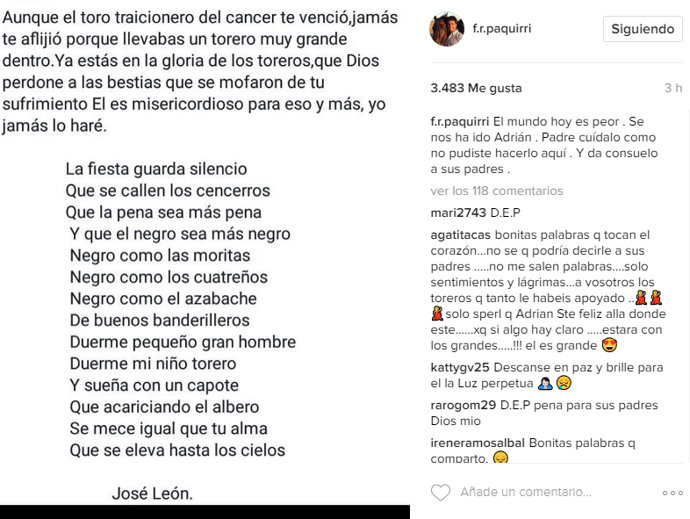 Adrián fallecía el pasado sábado por la tarde después de padecer durante años un Sarcoma de Ewing y encontrar en los toreros a sus verdaderos héroes y su mejor tratamiento. Por eso mismo toreros de nuestro país han querido rendirle homenaje a través de las redes sociales, el escenario que se convirtió en un campo de batalla por el enfrentamiento entre los amantes del toreo y los antitaurinos, que llegaron incluso a desearle la muerte a sus ocho años.
