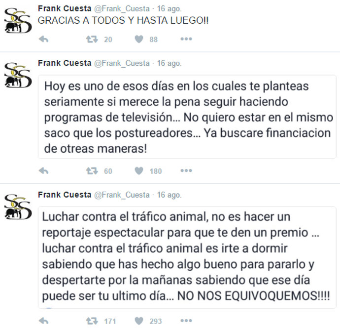 Como ya os contamos en CHANCE, el extenista nos sorprendía con tres mensajes en sus perfiles en los que dejaba entrever que pretendía retirarse de la televisión, ya que el único objetivo que él pretende alcanzar es acabar con el maltrato animal y "no quiere estar en el mismo saco que otros postureadores", tal y como explicaba el propio Frank.