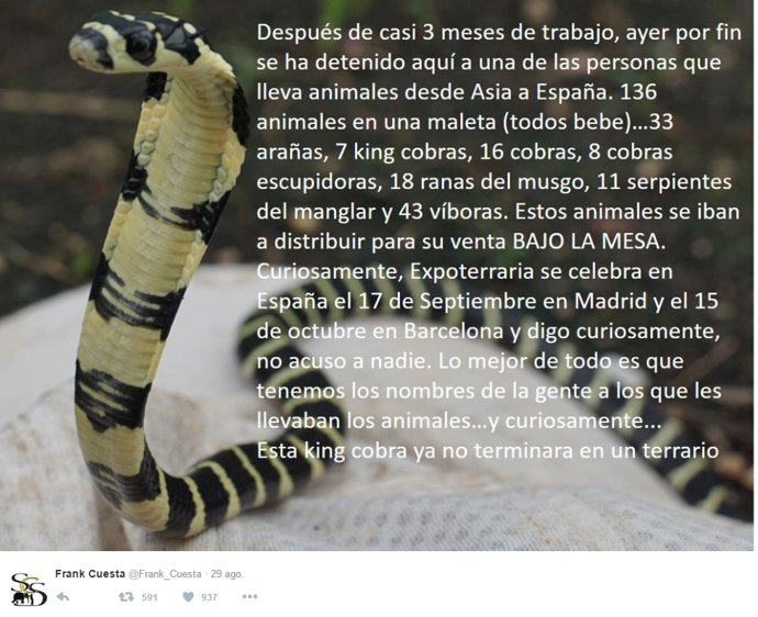 "Después de casi 3 meses de trabajo, ayer por fin se ha detenido aquí a una de las personas que lleva animales desde Asia a España. 136 animales en una maleta (todos bebé)...33 arañas, 7 king cobras, 16 cobras, 8 cobras escupidoras, 18 ranas del musgo, 11 serpientes del manglar y 43 víboras. Estos animales se iban a distribuir para su venta BAJO LA MESA. Curiosamente, Expoterraria se celebra en España el 17 de Septiembre en Madrid y el 15 de octubre en Barcelona y digo curiosamente, no acuso a nadie. Lo mejor de todo es que tenemos los nombres de la gente a los que les llevaban los animales...y curiosamente... Esta king cobra ya no terminara en un terrario", ha escrito Cuesta junto a la fotografía de una serpiente.