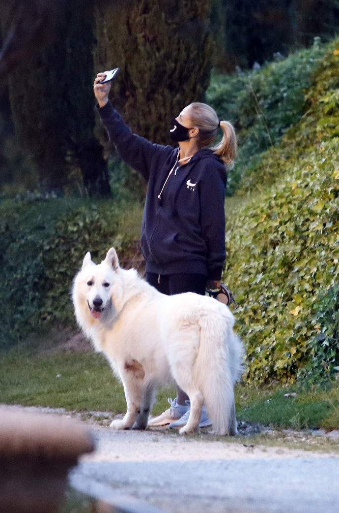 Tirando de su perro en alguna ocasión durante el paseo para evitar que se enzarzara con otras mascotas, Genoveva estuvo de lo más relajada. Para esta ocasión eligió un look muy cómodo con leggings negros por debajo de la rodilla, sudadera con capucha y zapatillas de deporte.