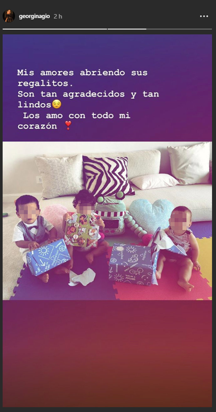 Encantada con su nueva residencia, Georgina ha querido presumir de sus tres bebés en una tierna fotografía. En uno de sus stories de Instagram se pueden ver a Alana Martina, a Eva María y a Mateo Ronaldo abriendo unos regalos en lo que parece ser el salón de su nueva casa.