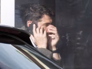 El exmarido de Sara Carbonero atiende el teléfono y se toca su rostro, como si le hubiesen dado una mala noticia o hubiese recibido una información que no esperaba.