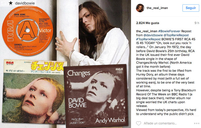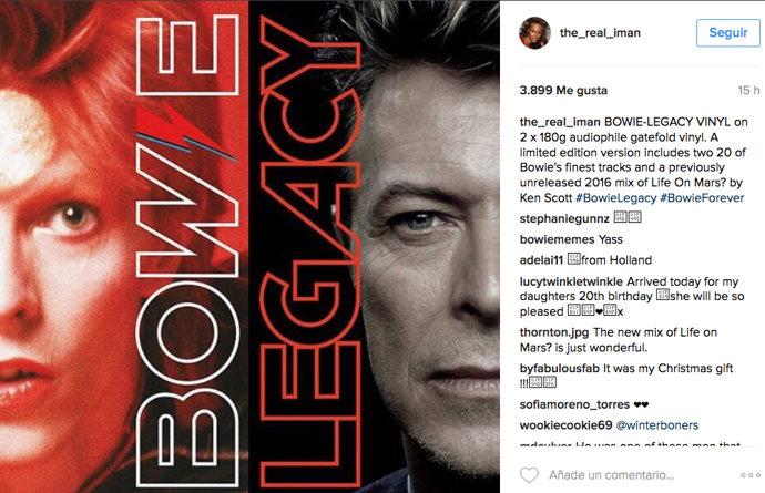No es la primera vez que la actriz ocasional rinde tributo a su marido a lo largo de este triste último año. Asimismo, desde hace semanas se ha convertido en la mejor embajadora del último lanzamiento musical relacionado con el camaleón del rock, una edición especial de Bowie-Legacy, que incluye sus últimos singles además de una versión inédita de Life on Mars?.