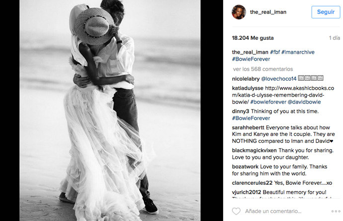 El próximo martes, 10 de enero, se cumplirá el primer aniversario de la muerte de David Bowie y su viuda, le ha rendido un romántico recuerdo en redes sociales. Hace un día, la modelo Iman compartía una bella imagen en blanco y negro de la pareja abrazados en la orilla de la playa y dándose un beso que ocultan en un gorro de paja. "#BowieSiempre", escribió la somalí.