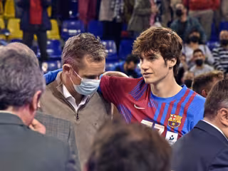 Tras el partido, que ha culminado con la victoria de FC Barcelona de balonmano, equipo para el que juega Pablo Urdangarin. Padre e hijo se han dedicado unos momentos muy cariñosos tras el partido y se han mostrado de lo más unidos ante las cámaras dedicándse unas sonrisas y un abrazo en la pista.