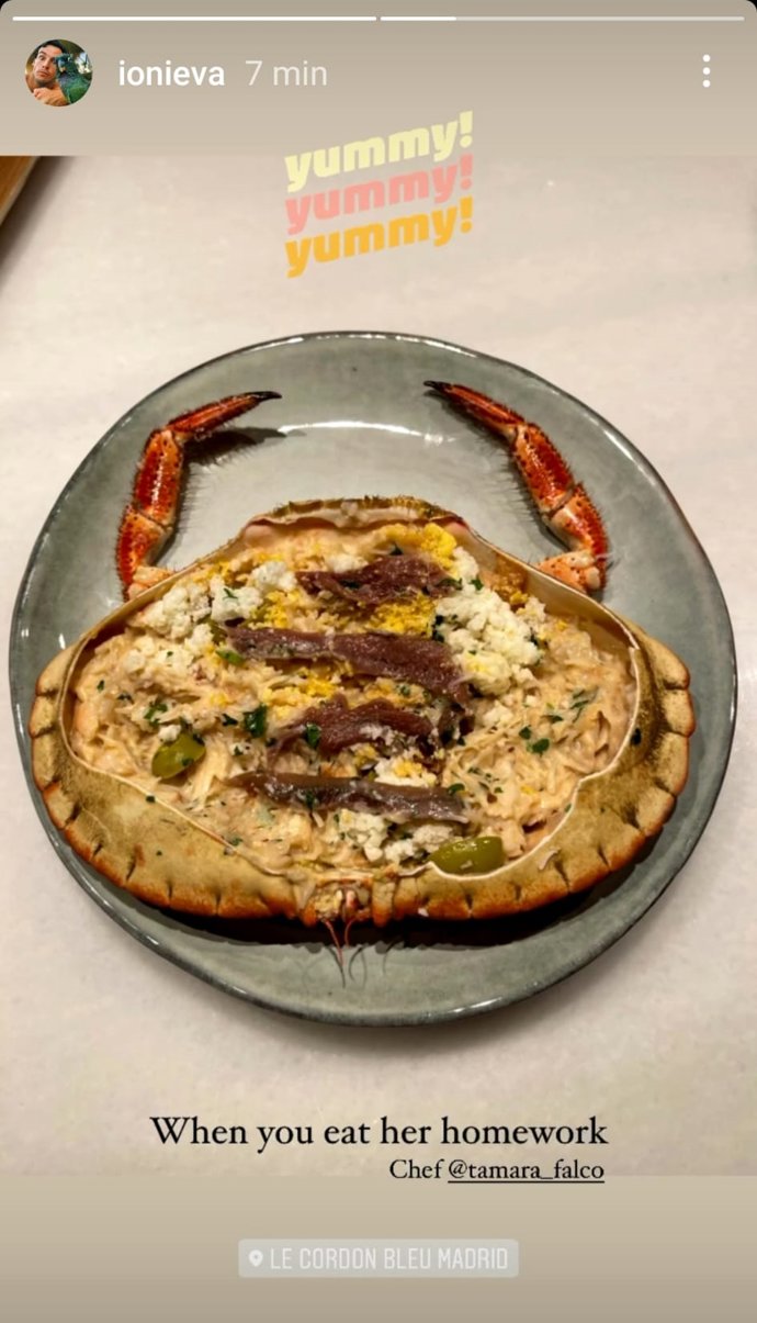 Un plato que a juzgar por la imagen se trata de un cangrejo relleno de una bechamel de marisco, con anchoas y aceitunas. Nos derretimos con la pintaza que tiene, pero sobre todo, nos encantaría ver cómo estos dos tortolitos disfrutan de la velada de esta noche, en la que seguro se quedan de lo más saciados posibles ante las artes culinarias de la hija de Isabel Preysler.
