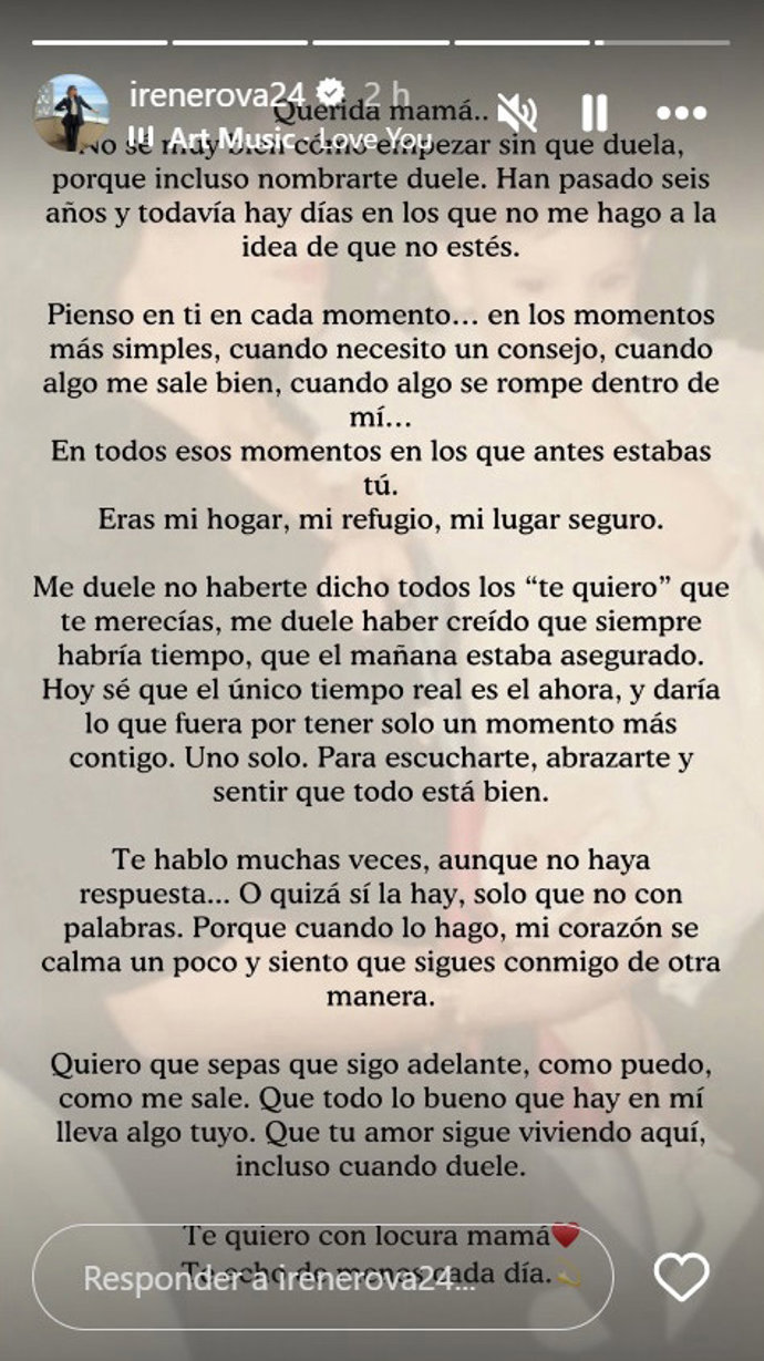 Y aunque hace seis años que perdió a su madre, Irene ha revelado que "te hablo mucha veces, aunque no haya respuesta o, quizás sí la hay, solo que no con palabras, porque cuando lo hago, mi corazón se calma un poco y siento que sigues conmigo de otra manera".