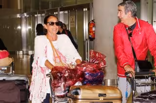 Isabel llegó al aeropuerto con un moreno muy favorecedoracompañada por su hermano Agustín Pantoja y vestida con un típico poncho mexicano. La cantante llegó cargada de bolsas del aeropuerto que seguramente irían llenas de regalos para sus hijos y para su nieto Francisco.
