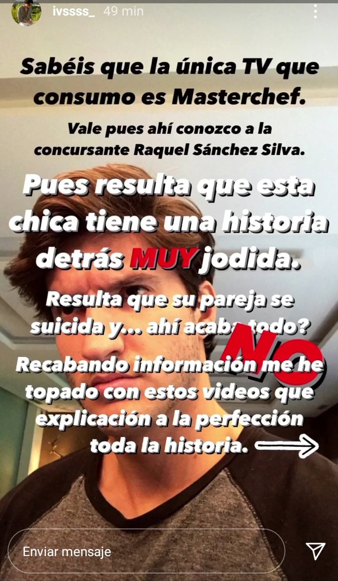 "Sabéis que la única TV que consumo es Masterchef. Vale, pues ahí conozco a la concursante Raquel Sánchez Silva. Pues resulta que esta chica tiene una historia detrás MUY jodida. Resulta que su pareja se suicida y... ahí acaba todo? NO. Recabando información me he topado con estos vídeos que explican a la perfección toda la historia"