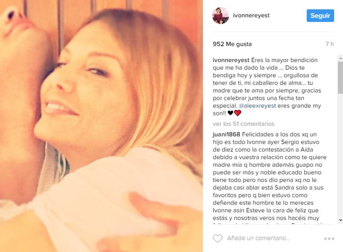 El mensaje de su cuenta personal de Instagram decía lo siguiente: "Eres la mayor bendición que me ha dado la vida ... Dios te bendiga hoy y siempre ... orgullosa de tener de ti, mi caballero de alma... tu madre que te ama por siempre, gracias por celebrar juntos una fecha tan especial. @aleexreyest eres grande my son!! " y citaba a su hijo.