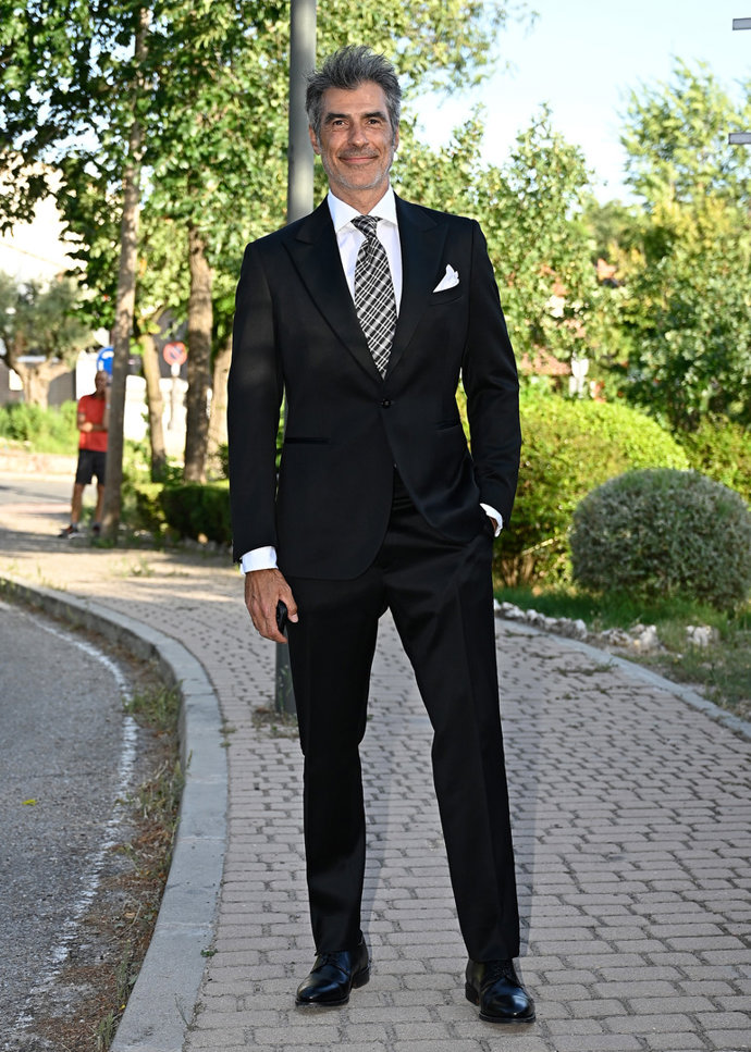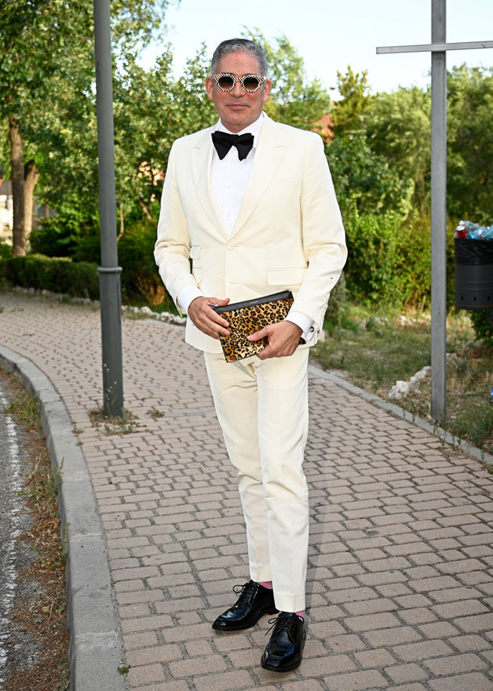 Derrochando elegancia, los novios eligieron un esmoquin de chaqueta blanca con solapas de pico y pajarita a juego, y pantalones negros. Un perfecto estilismo que combinaron con unos mocasines de charol.