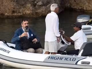 De momento, le hemos visto en compañía de amigos. Precisamente se marchó en una zodiac con dos acompañantes. Jaime, que iba elegantemente vestido con chaqueta y pantalón de vestir, necesitó la ayuda de su amigo para subir a la embarcación.