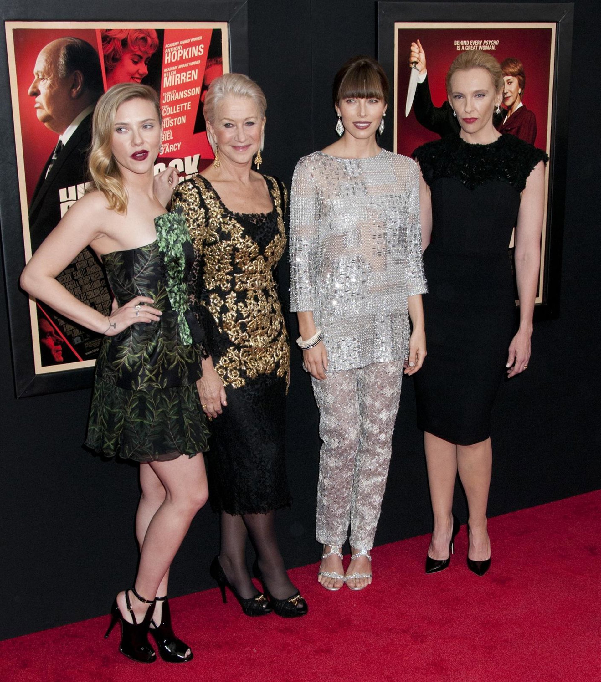 En el estreno de la película biográfica del director Alfred Hitchcock se echó en falta su protagonista Anthony Hopkins, pero lo que no faltó fue glamour gracias a las protagonistas de la cinta: Jessica Biel, Scarlett Johansson y Helen Mirren.